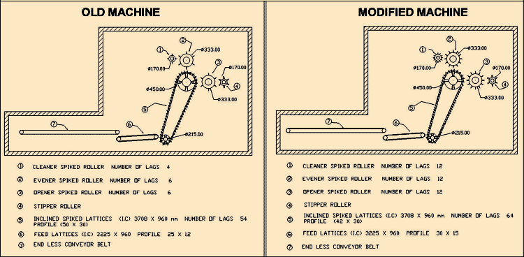 We are undertaking up gradation of old MBO’s by replacing old metallic spiked rolls & Spiked Lattices with precision made matched wooden spiked lattices and wooden spiked evener and stripper rollers having stipulated space gauging & teeth meshing . The increased number of spiked lags on the striper roll & the Spiked Lattice considerably improves the efficiency of the machine; which saves power consumption and labour & improves the mixing & blending of material.
